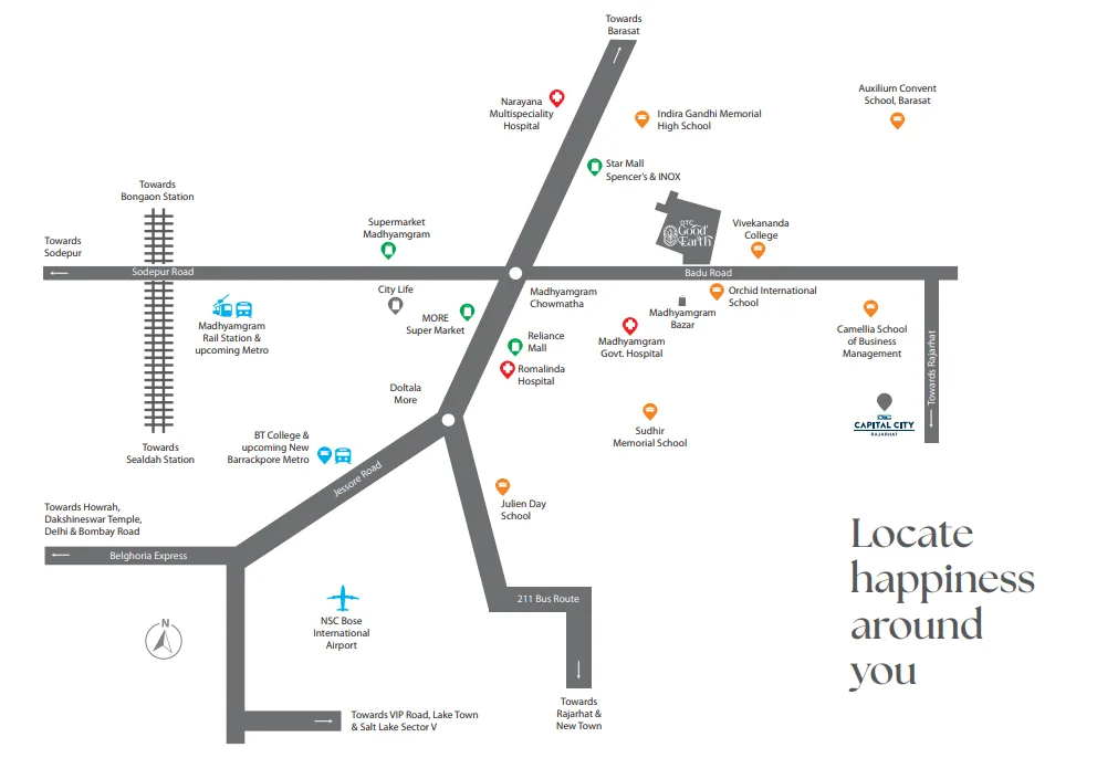 Location Not too far, Not too close just right Transportation • Madhyamgram Station – 2 km • Barasat Railway Station – 7 km Healthcare Facilities • Heartland Hospital – 3 km • Vivacity Hospital – 3 km Education Institution • Orchid International School – 10 mtr • Julien Day School – 4 km Markets & Malls • Star Mall – 3 km • Reliance Mall – 3 km